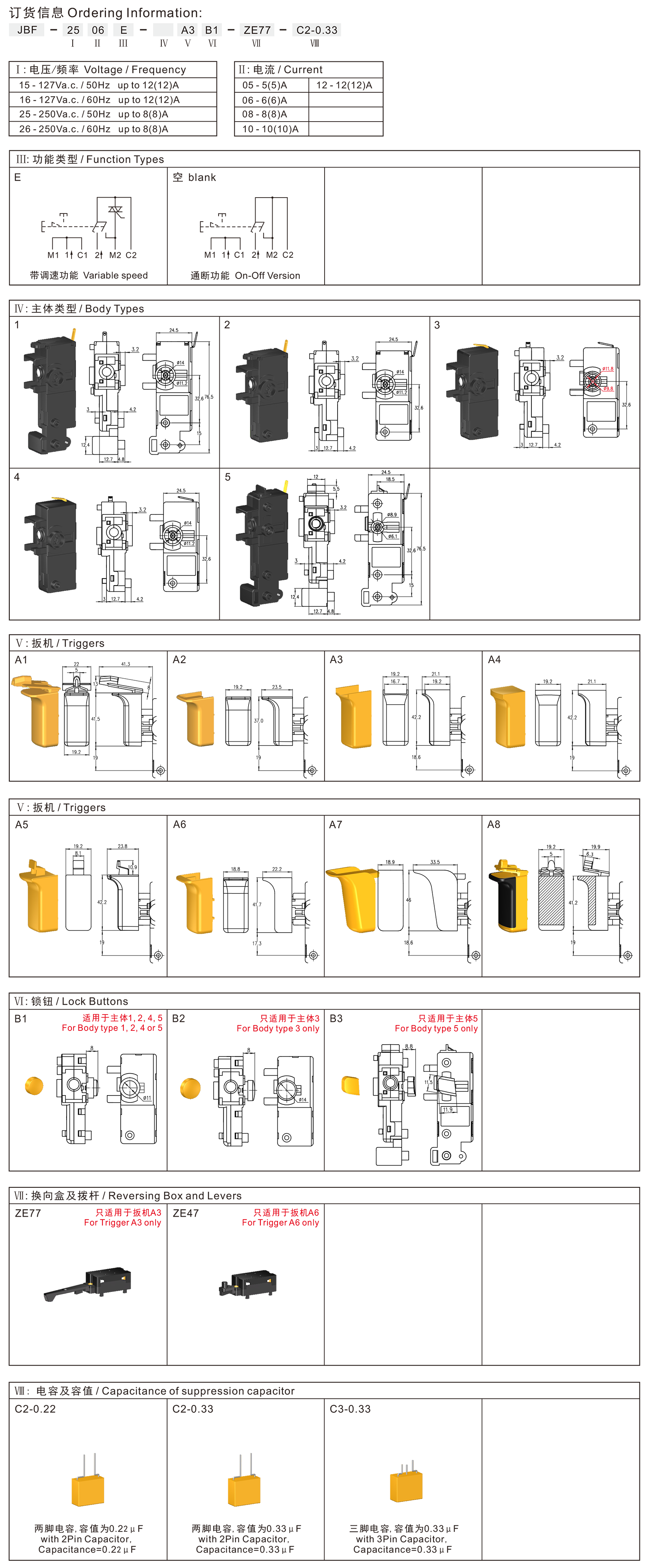 ◆JBF series are special type variable speed trigger switches, integrated dustproof, for used in portable power-tools such as: Drills, Impact Drills, Rotary Hammers, Jig Saws, Reciprocating Saws, Sabre Saws, Electric Mixers, Polishers, Orbit Sanders, etc.