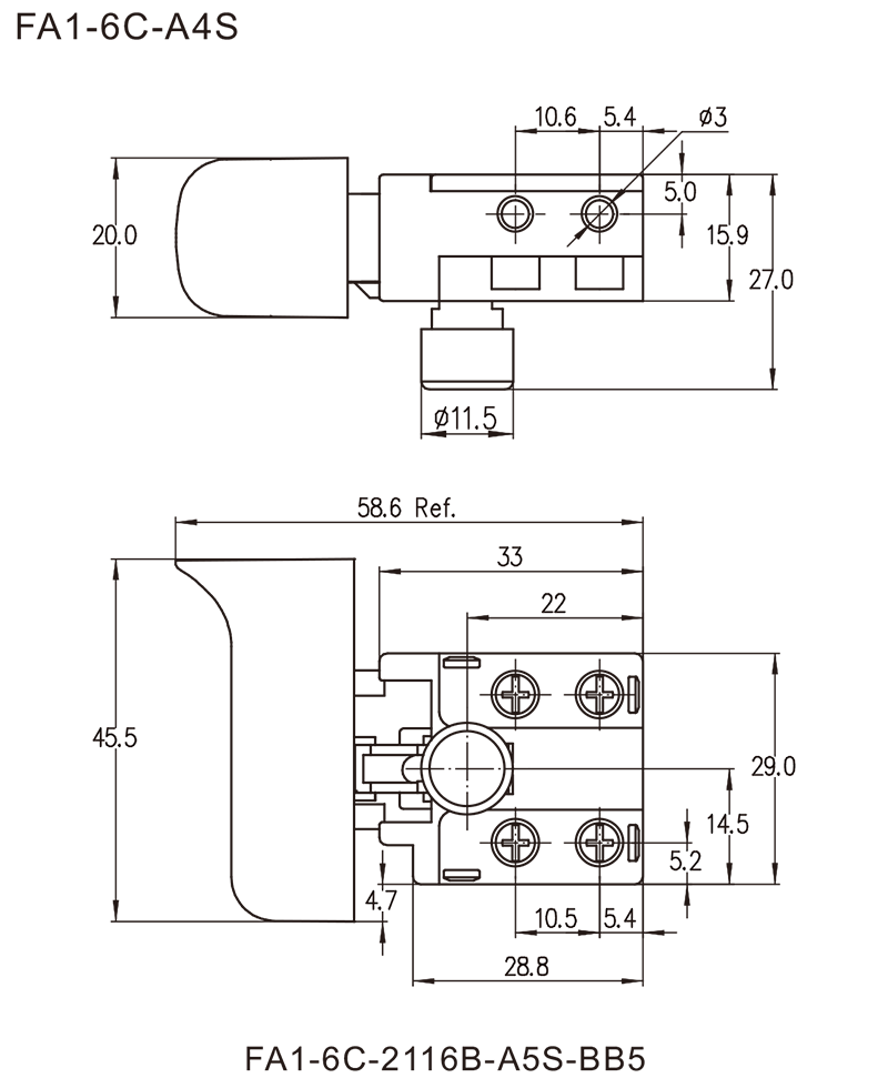 FA1-6C series are general type trigger switch, integrated dustproofwith snap-action structure, commonly for used in portable power tools such as Electric Drills, Rotary Hammers, Reciprocating Saws, Jig Saws, Angle Grinders, Electric Mixers, Cut-Off Machines, Marble Cutters, Electric Routers, Circular Saws, Belt Sanders, Orbit Sanders, Polishers, Electric Planers, Electric Sprayers, Electric Nailers, etc. Besides, they are also suitable for gardening tools, such as Grass Trimmers, Electric Chain Saws, Electric Lawnmowers, Electric Snowthrowers, etc.
