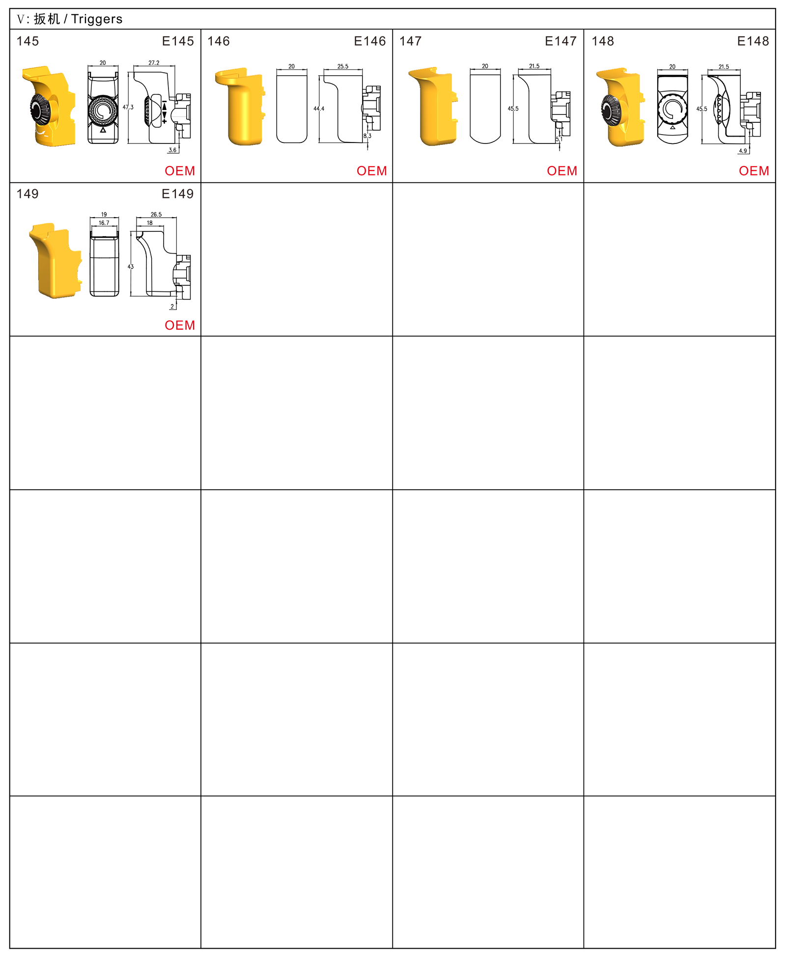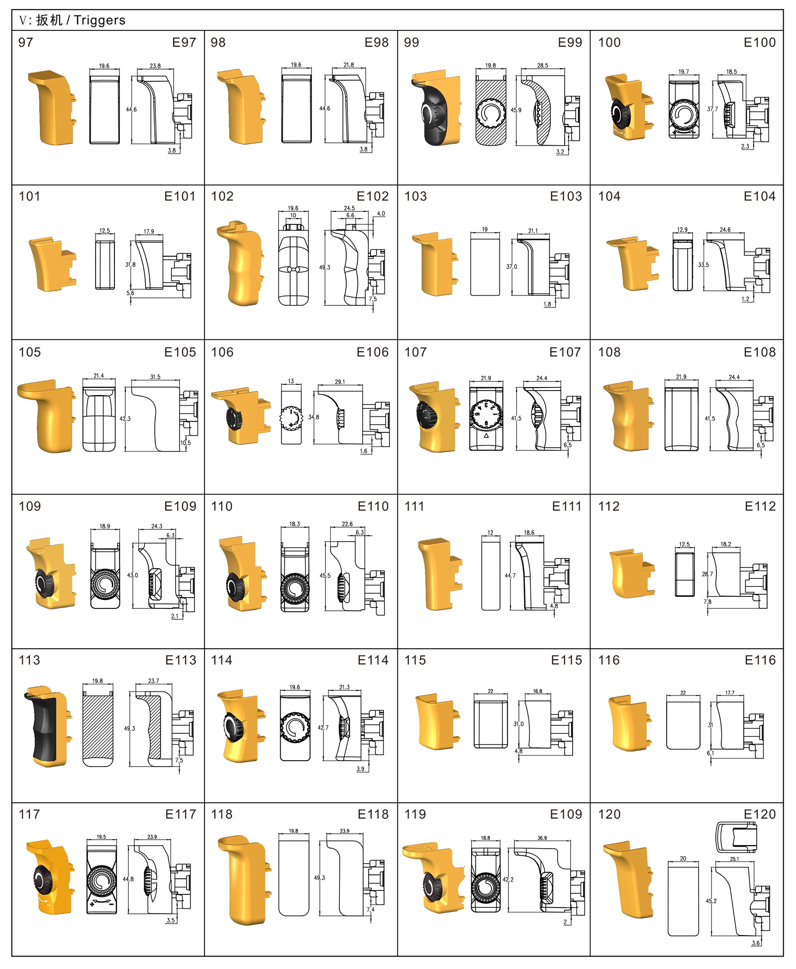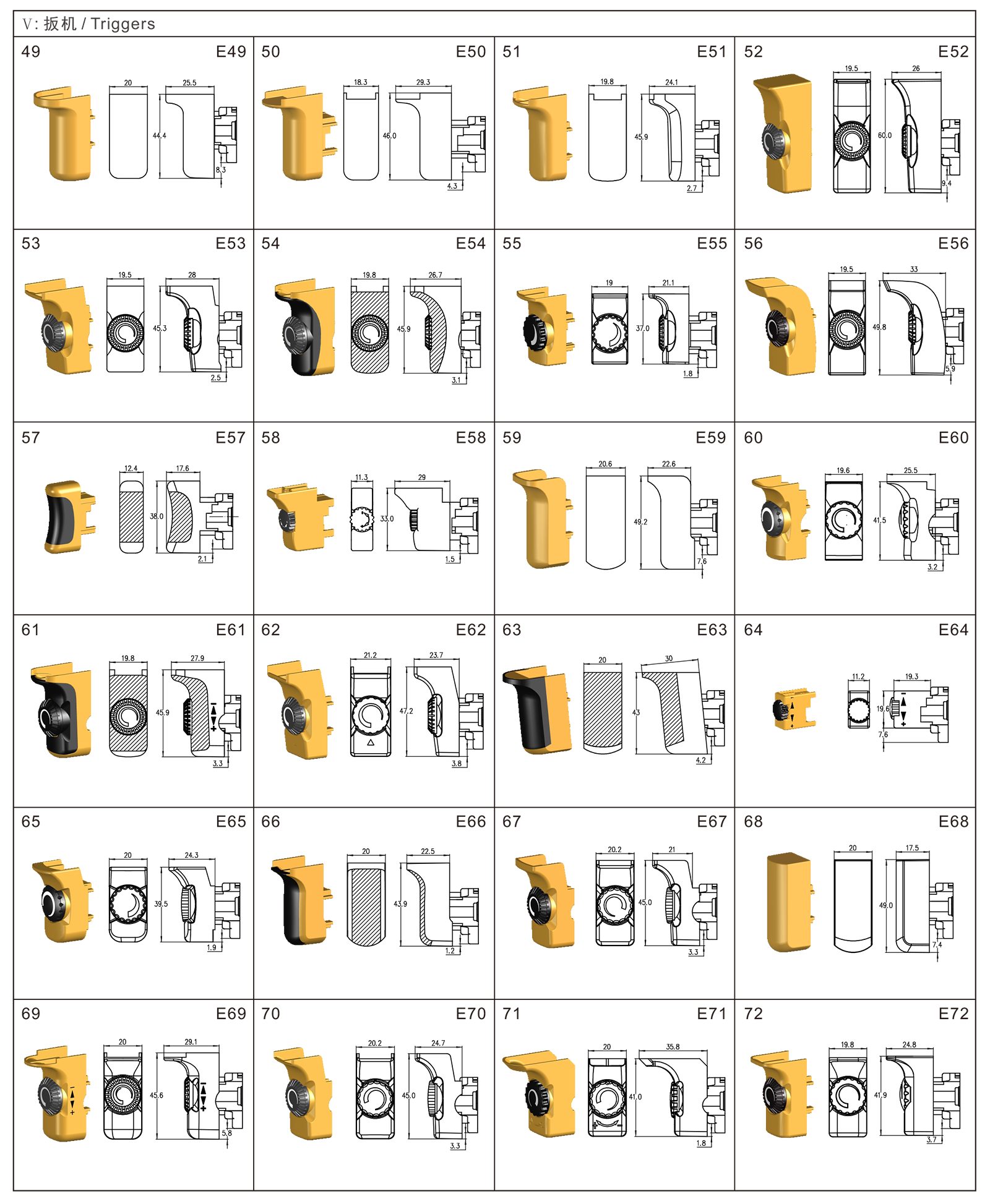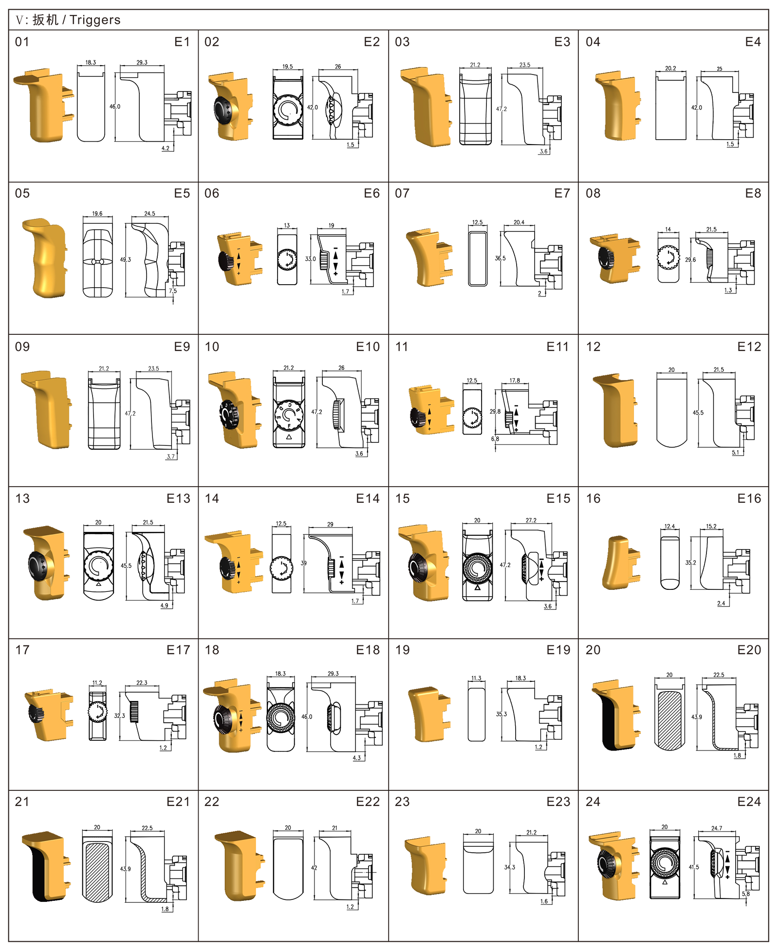 FA2-6E系列是一款通用型扳機電子調速開關,集成防塵功能,廣泛應用于各類手持式電動工具,如:電鉆、沖擊鉆、電錘、曲線鋸、往復鋸、攪拌器、拋光機和砂光機等。開關有多種換向盒可以選擇,扳機、鎖鈕和撥桿可根據客戶要求進行定制。