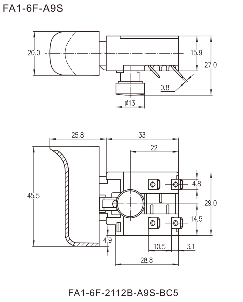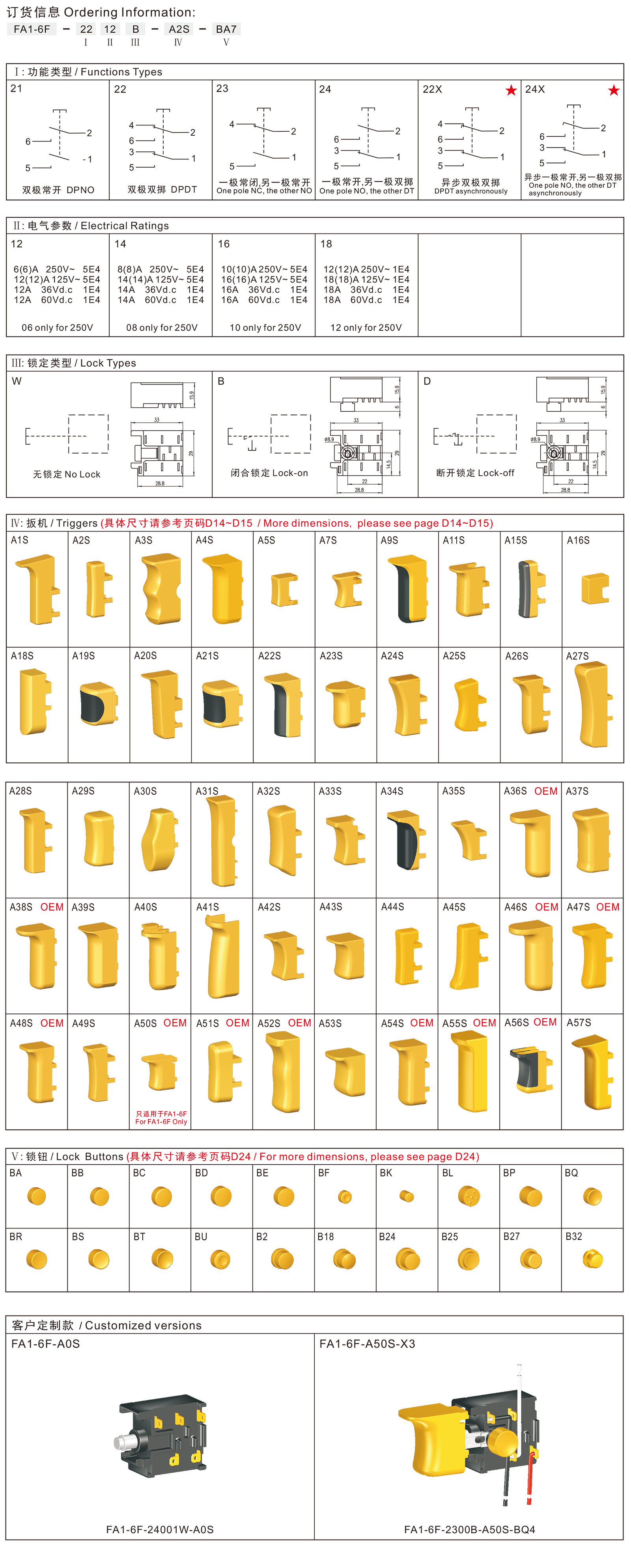 ◆FA1-6F series are general type trigger switches, integrated dustproof, commonly for used in portable power tools such as Electric Drills, Rotary Hammers, Reciprocating Saws, Jig Saws, Angle Grinders, Electric Mixers, Cut-Off Machines, Marble Cutters, Electric Routers, Circular Saws, Belt Sanders, Orbit Sanders, Polishers, Electric Planers, Electric Sprayers, Electric Nailers, etc. Besides, they are also suitable for power gardening tools, such as Grass Trimmers, Electric Chain Saws, Electric Lawnmowers, Electric Snowthrowers, etc.