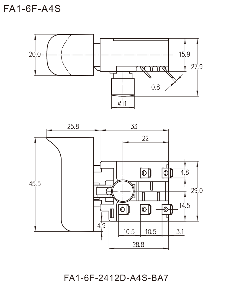◆FA1-6F series are general type trigger switches, integrated dustproof, commonly for used in portable power tools such as Electric Drills, Rotary Hammers, Reciprocating Saws, Jig Saws, Angle Grinders, Electric Mixers, Cut-Off Machines, Marble Cutters, Electric Routers, Circular Saws, Belt Sanders, Orbit Sanders, Polishers, Electric Planers, Electric Sprayers, Electric Nailers, etc. Besides, they are also suitable for power gardening tools, such as Grass Trimmers, Electric Chain Saws, Electric Lawnmowers, Electric Snowthrowers, etc.