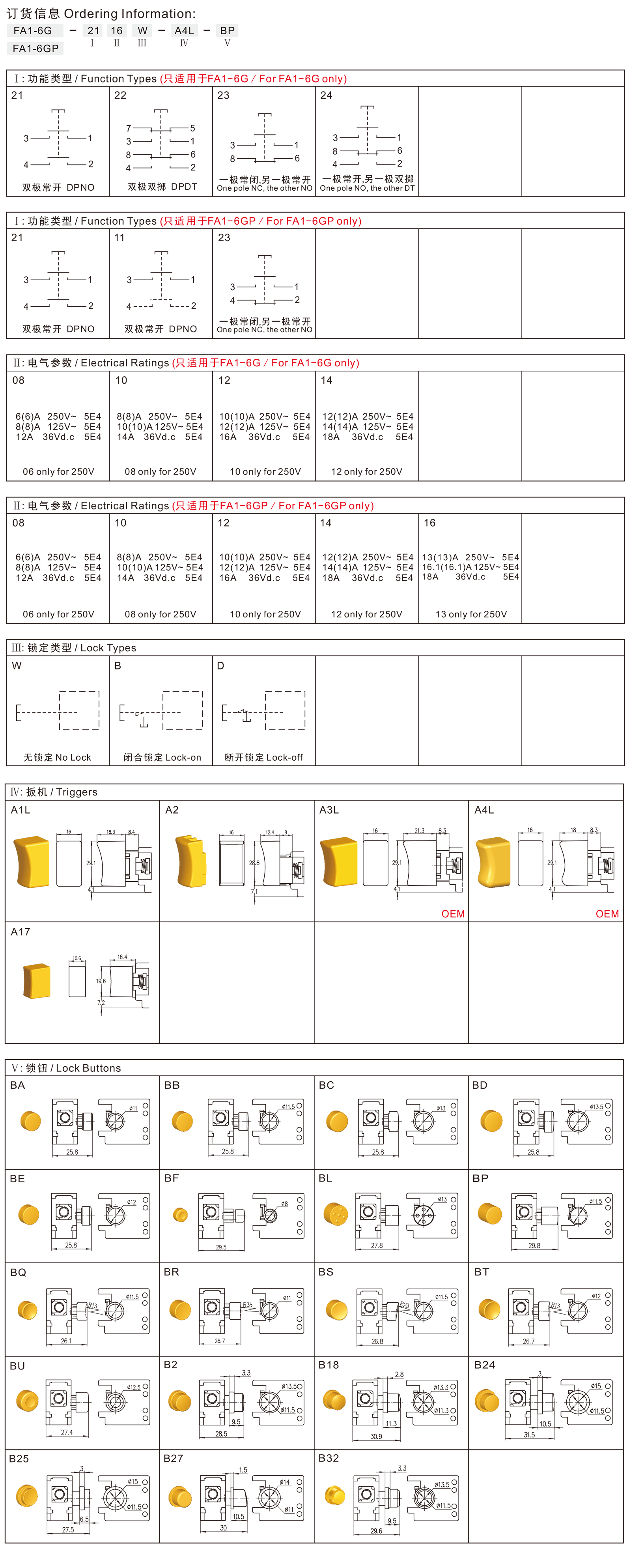 FA1-6G/FA1-6GP series are general type trigger switches, integrated dustproof, commonly for used in portable power tools such as Electric Drills, Rotary Hammers, Reciprocating Saws, Jig Saws, Angle Grinders, Electric Mixers, Cut-Off Machines, Miter Saws, Marble Cutters, Electric Routers, Circular Saws, Belt Sanders, Orbit Sanders, Polishers, Electric Planers, Electric Sprayers, Electric Nailers, etc. Besides, also suitable for power gardening tools, such as Electric Chain Saws, Electric Lawnmowers, Electric Snowthrowers, etc.
