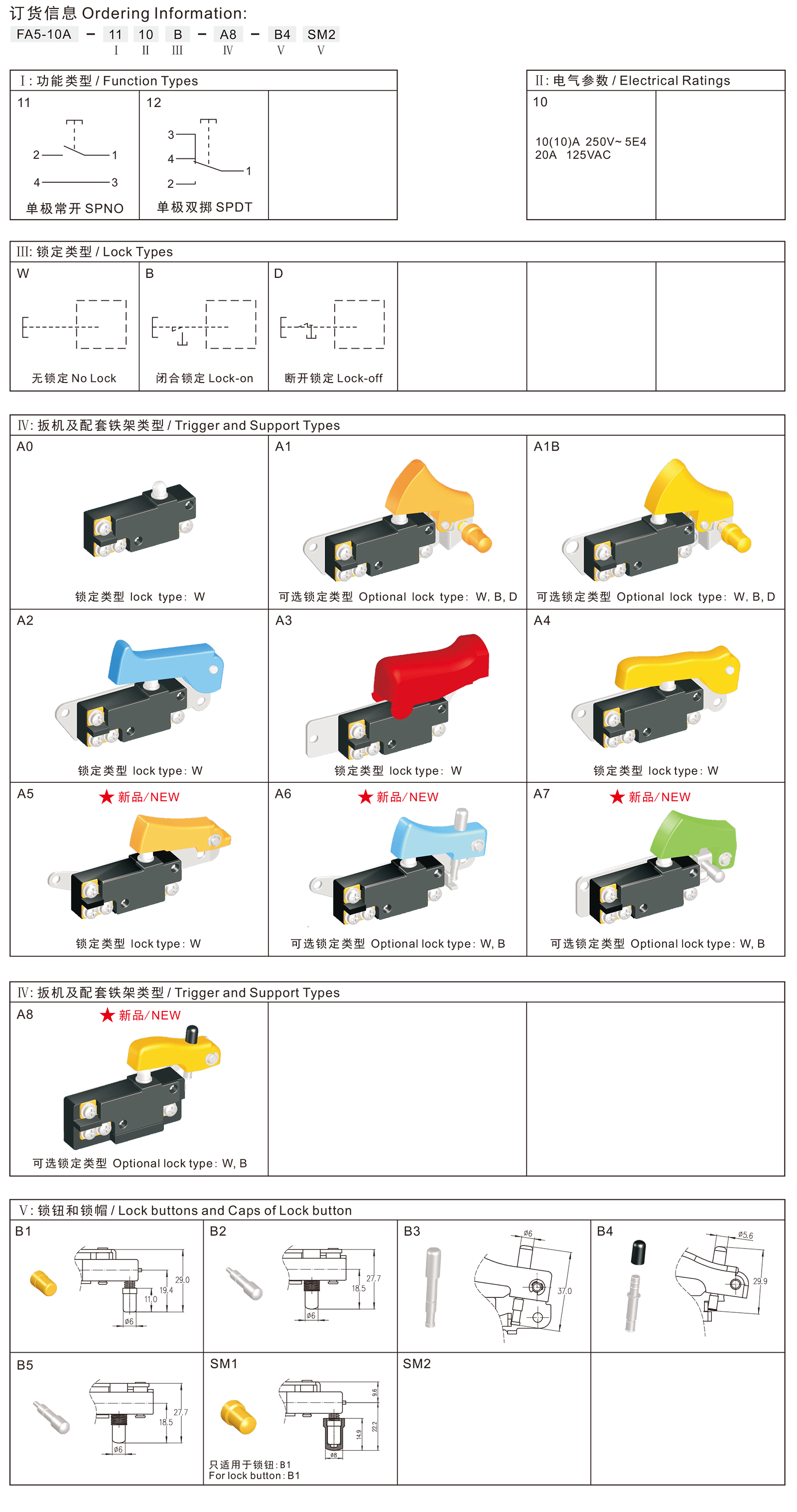 ◆FA5-10A, FA5-10B series are one general type trigger switch, integrated dustproof, with snap-action structure, for used in portable or bench top power-tools such as Cut-off Machines, Miter Saws, 125mm and 150mm Angle Grinders, Rotary Hammers, Demolition Hammers, etc.