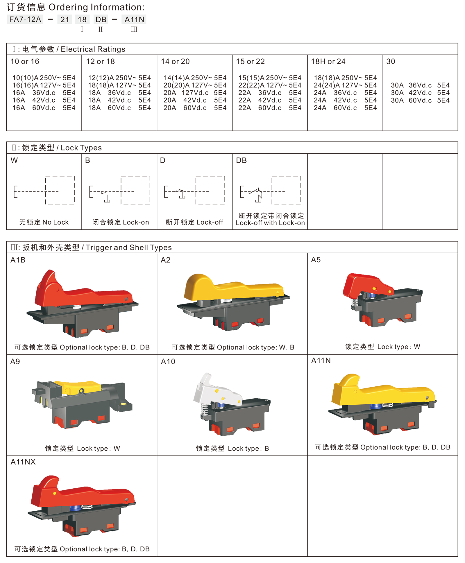 ◆FA7-12A series are general type high rated trigger switches,integrated dustproof, with snap-action structure, for used in high rated bench top or portable power-tools such as Cut-off Machines, Miter Saws, 180mm and 230mm Large Angle Grinders, Heavy Rotary Hammers, Heavy Demolition Hammers, etc. The body and trigger accept customize according to customer's request.