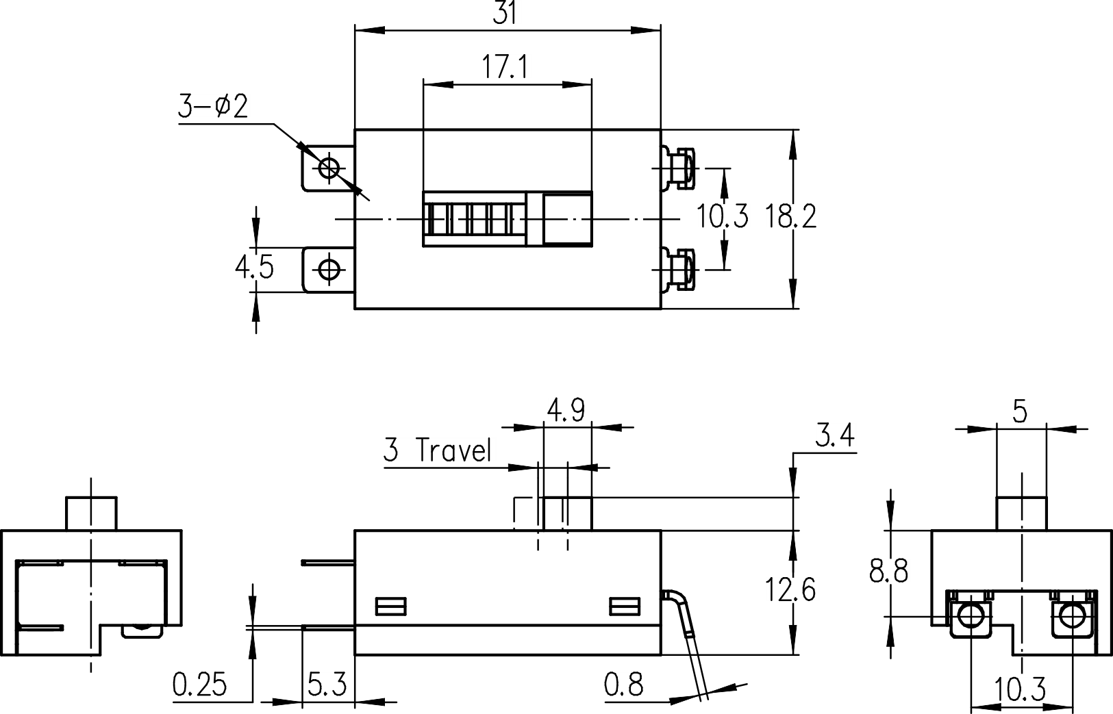 ◆FDK系列是一款通用型的推拉開關,也叫滑動開關,廣泛應用于各類需要檔位控制的電動工具和小家電,如:熱風槍、電吹風等。 ◆FDK series are general type slide switches, commonly for used in power-tools and small home appliances such as Heat Guns, Hair Drvers, etc.