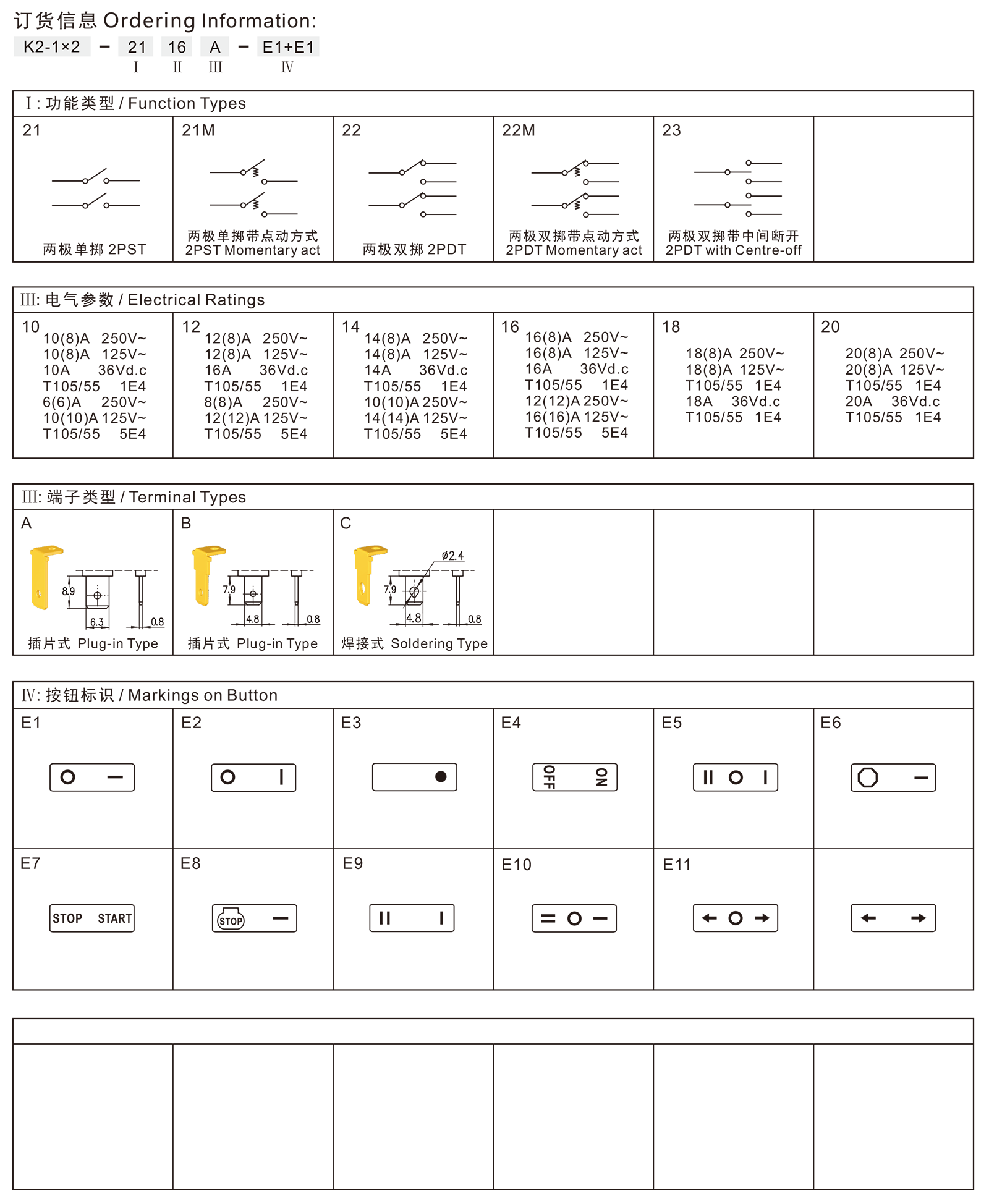 ◆K2-1x2系列是一款標(biāo)準(zhǔn)型的蹺板開(kāi)關(guān),也通稱船型開(kāi)關(guān)、波形開(kāi)關(guān)等,用途極廣,廣泛應(yīng)用于各類家用電器及辦公設(shè)備,如:電扇、飲水機(jī)、取暖器等。